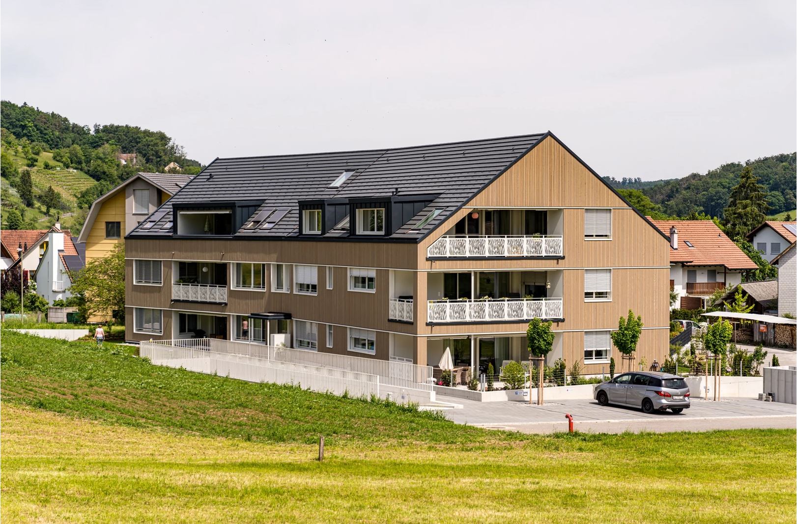 Das Mehrfamilienhaus «Mit’änand» in Ziefen BL bietet Raum für 7 Wohnungen im Stockwerkeigentum, grosszügige Gemeinschaftsräume und eine Einstellhalle auf einer Parzellengrössen von ca. 1300 M2. Das Untergeschoss ist in Beton gehalten – ab Erdgeschoss inkl. Treppenhaus besteht das komplette Gebäude aus Holz. Die Wärmeerzeugung ist mit einer SOLEE/Wasser-Wärmepumpe mit Raumkühlung versehen.